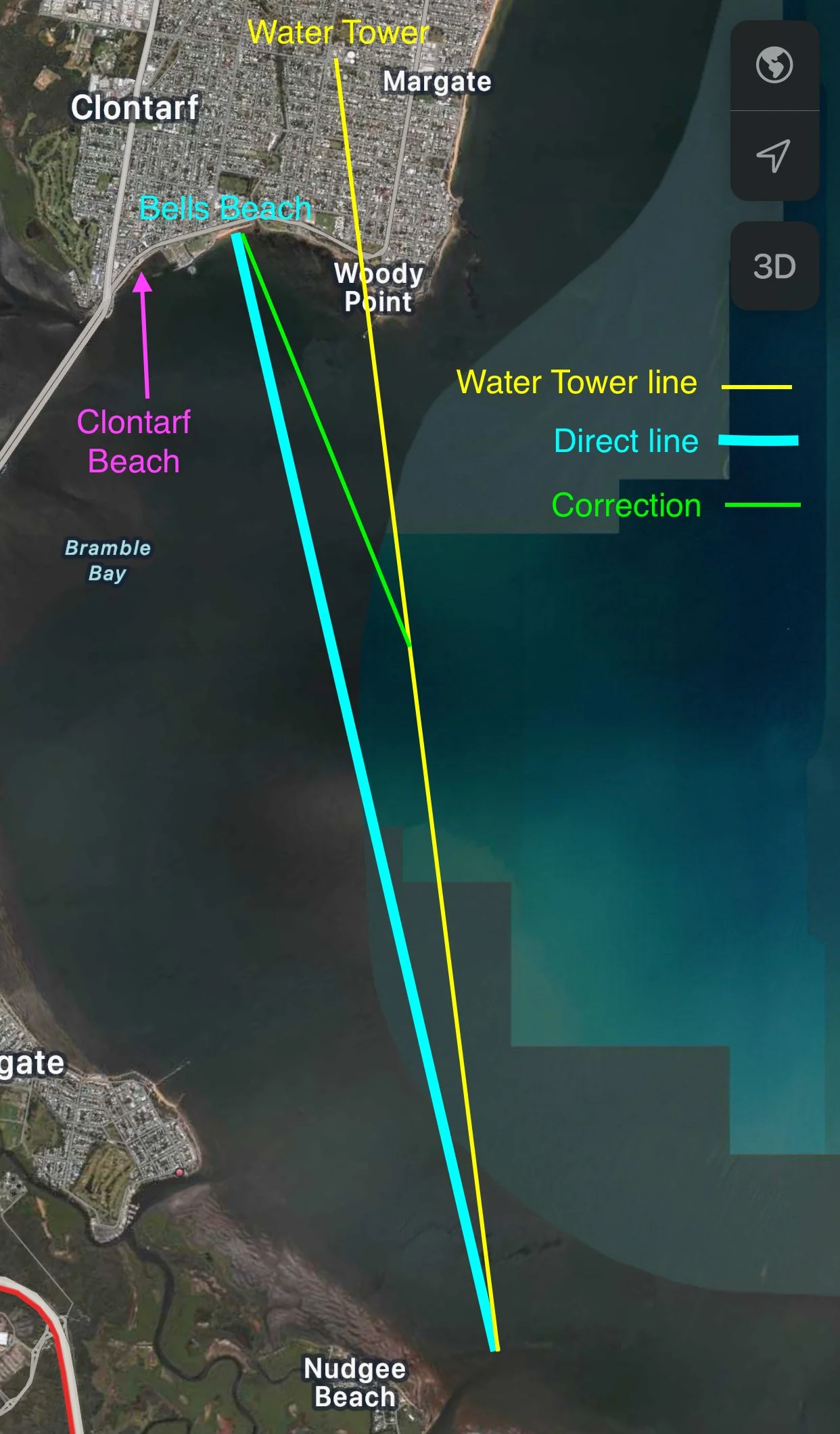 An early visible landmark on the Redcliffe Peninsula is the Redcliffe Water Tower at Margate. Tracking towards the Water Tower will leave athletes with only a small correction to make in the final kilometres as the sand of Bells Beach and Clontarf Beach come into view. Clontarf Beach will be further left (west), where the Ted Smout Memorial Bridge (Hornibrook Highway) meets the Peninsula, while Bells Beach will be between Clontarf Beach and the Water Tower.